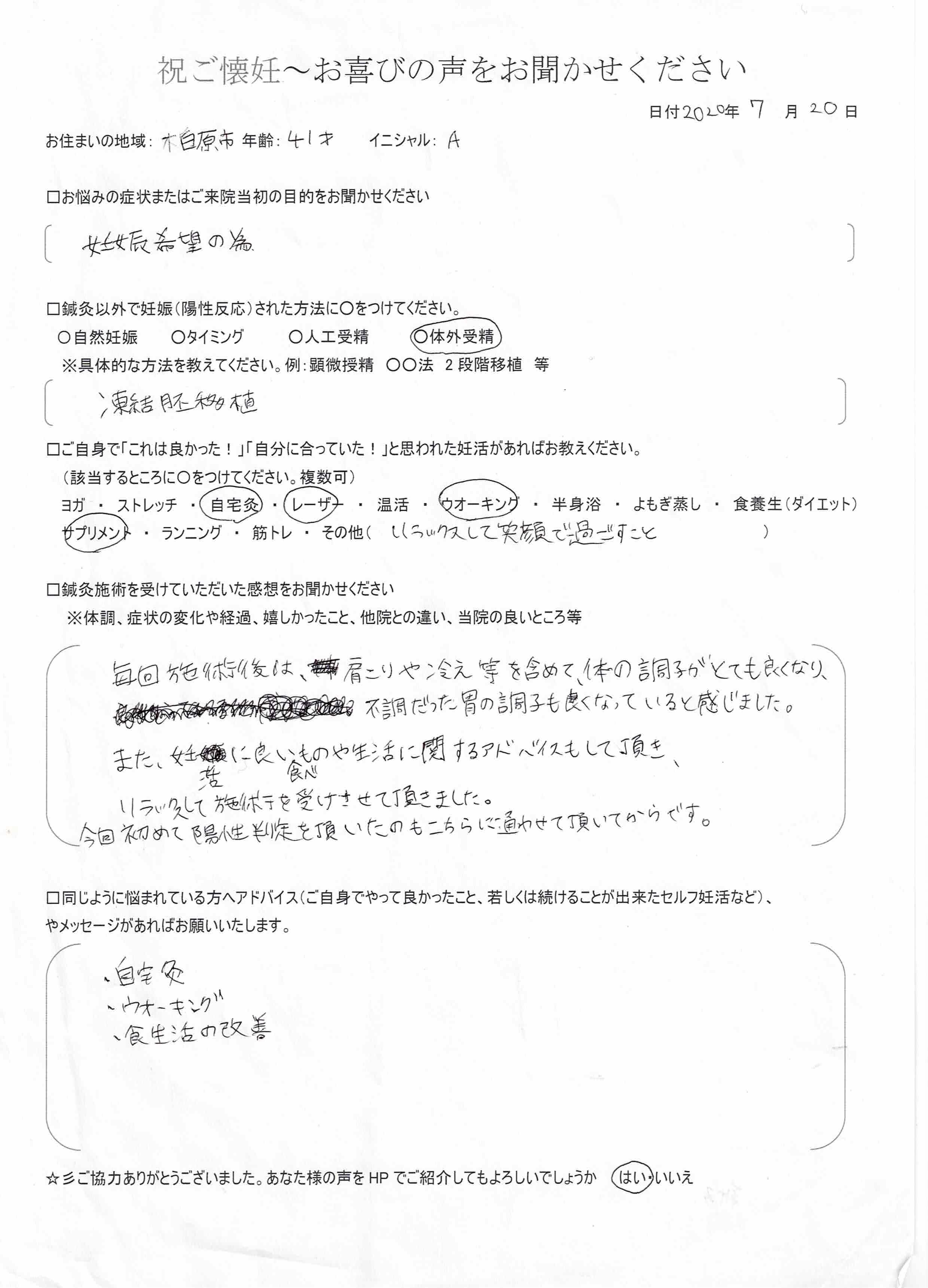 その後、無事に採卵を終え、移植に向けて鍼灸施術を継続されました。そして7月、凍結胚移植にて見事、陽性反応を確認することができました。