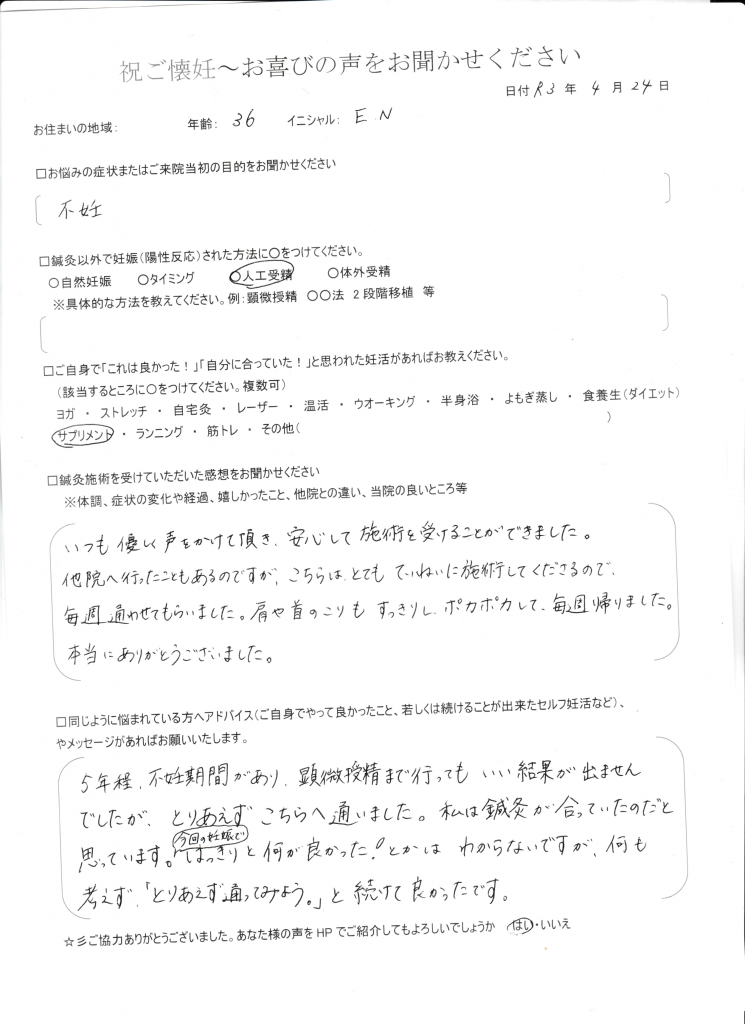 5年間、不妊期間があり、顕微授精まで行ってもいい結果が出ませんでしたが、とりあえずこちらへ通いました。私は鍼灸が合っていたのだと思っています。今回の妊娠ではっきりと何が良かった!とかはわからないですが、何も考えず「とりあえず通ってみよう!」と続けて良かったです。