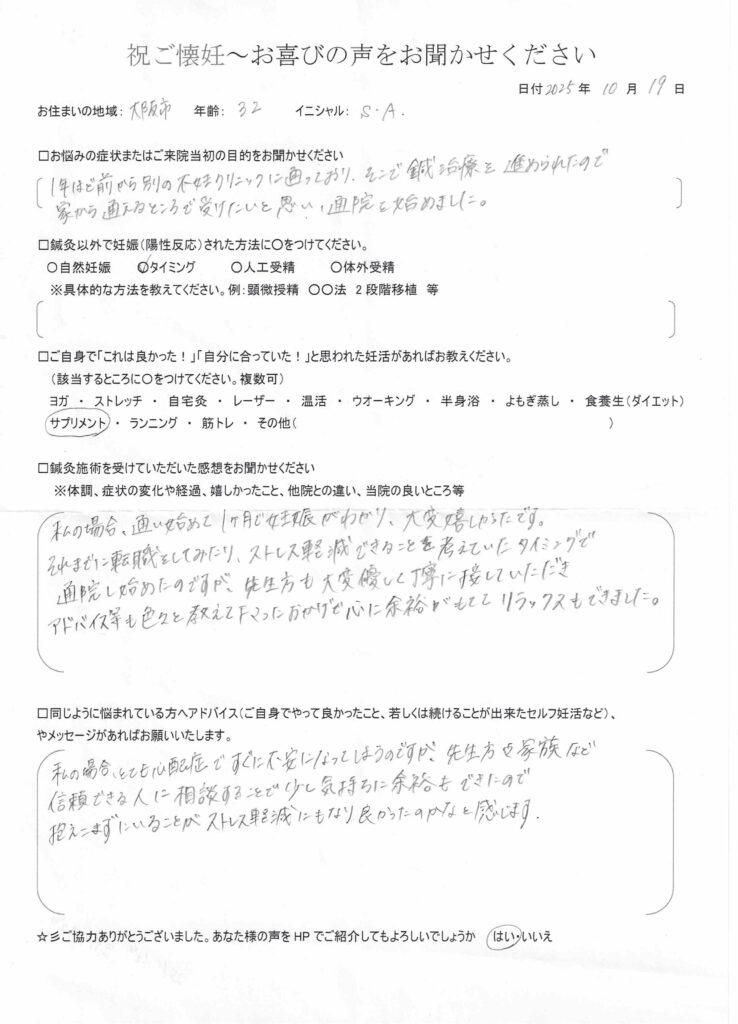 大阪市からお越しのSさん(32歳)がタイミング療法で妊娠されました。