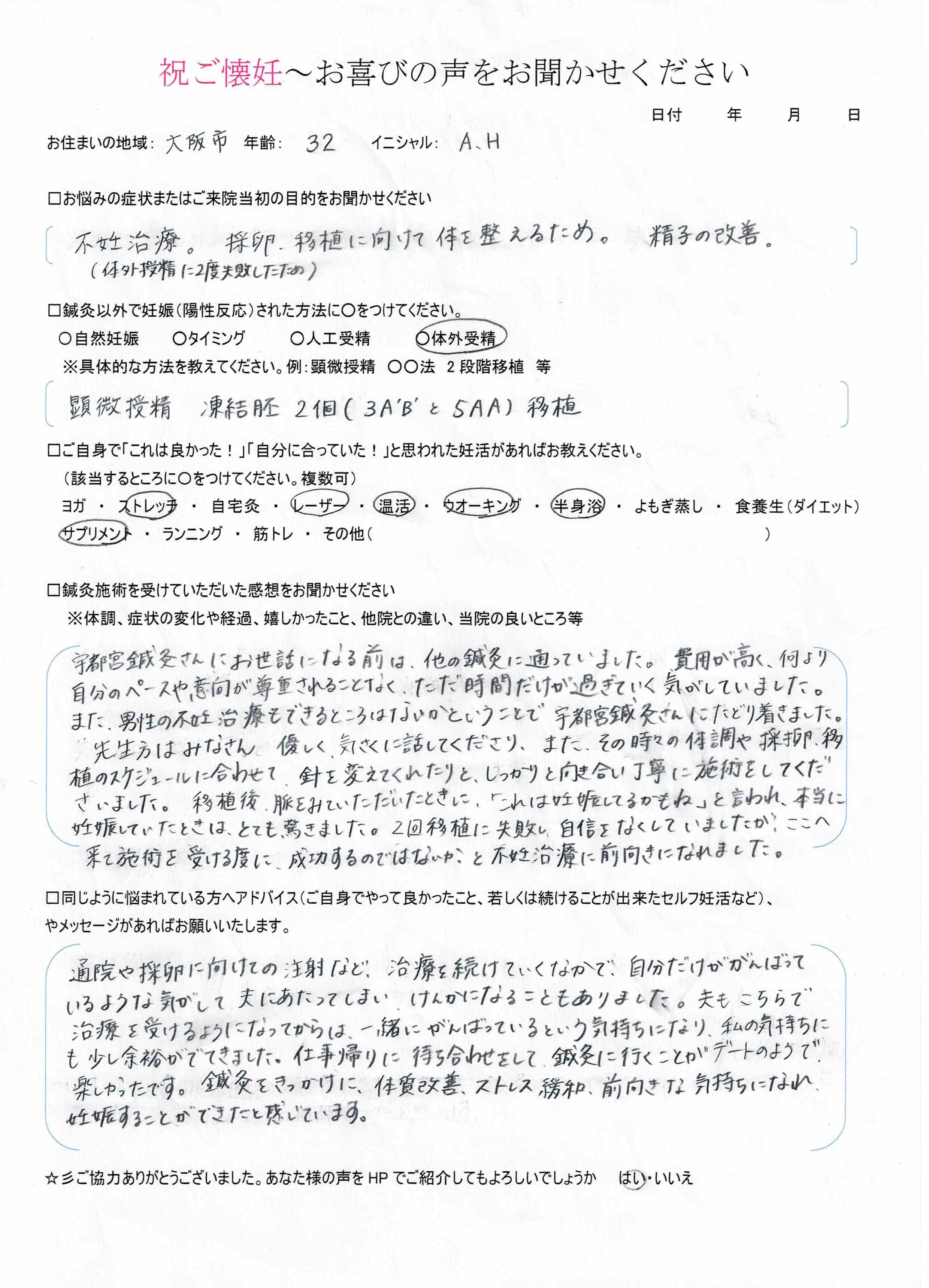 大阪市からお越しのHさんご夫婦(32歳)が妊娠されました。