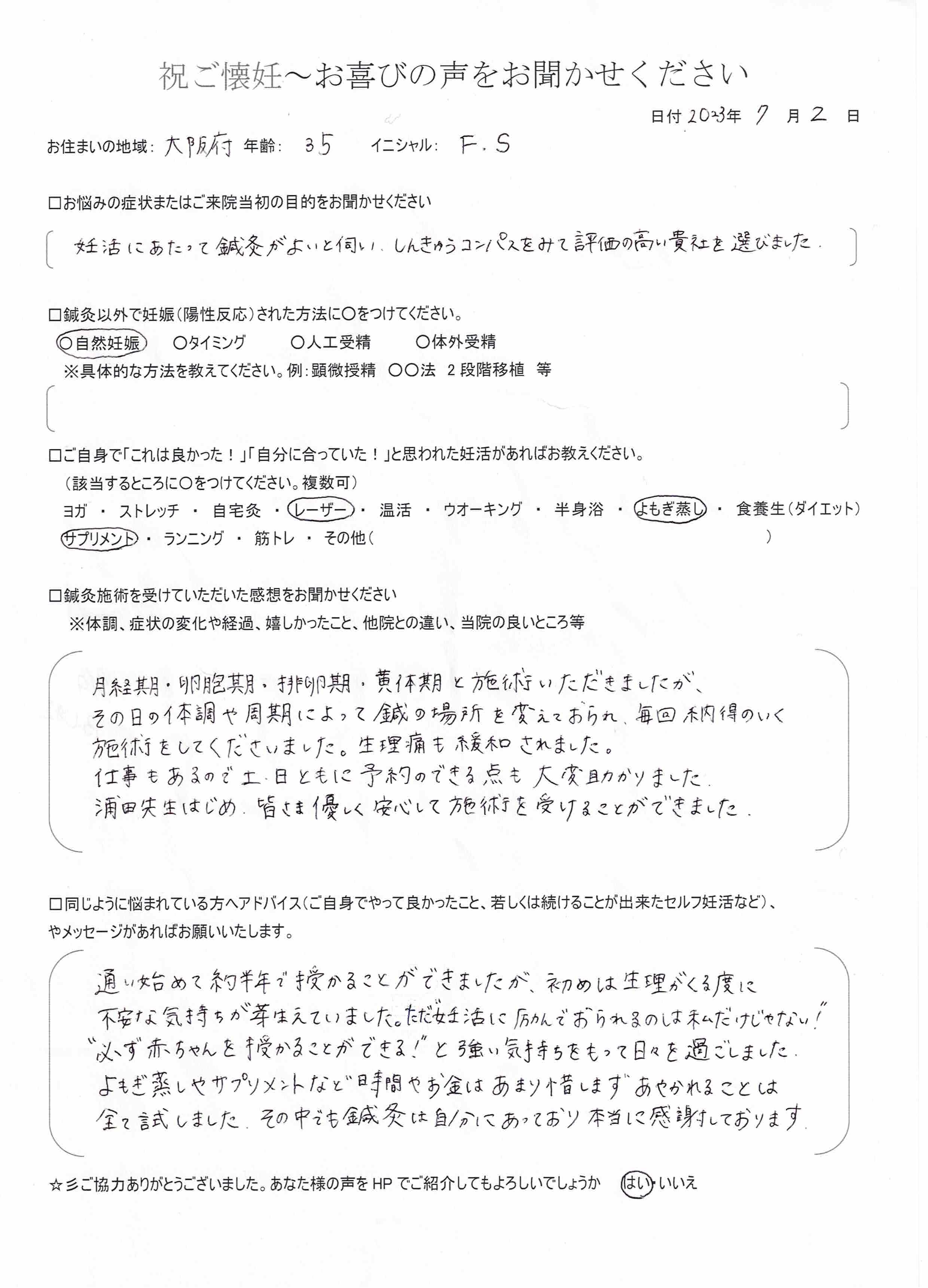 大阪府からお越しのSさん(35歳)が鍼灸とレーザーで身体を整え、自然妊娠されました。