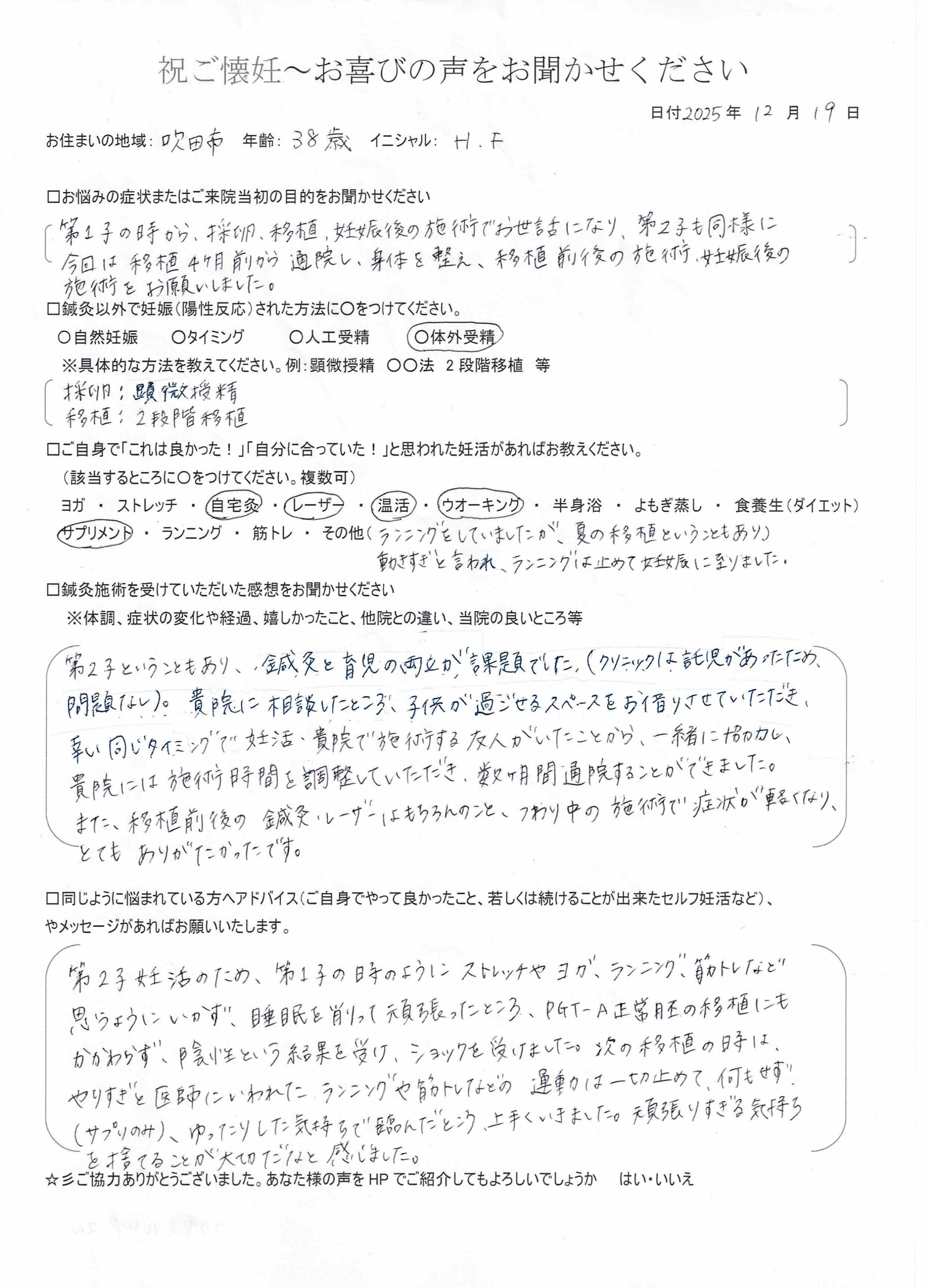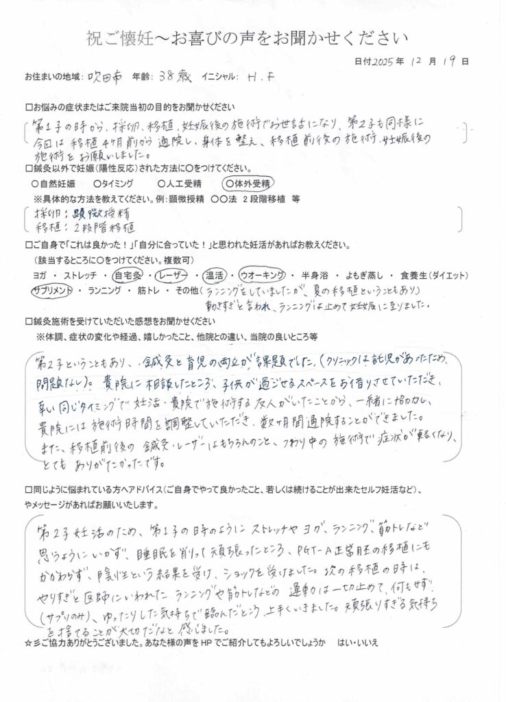 吹田市からお越しのHさん(38歳)が妊娠されました。